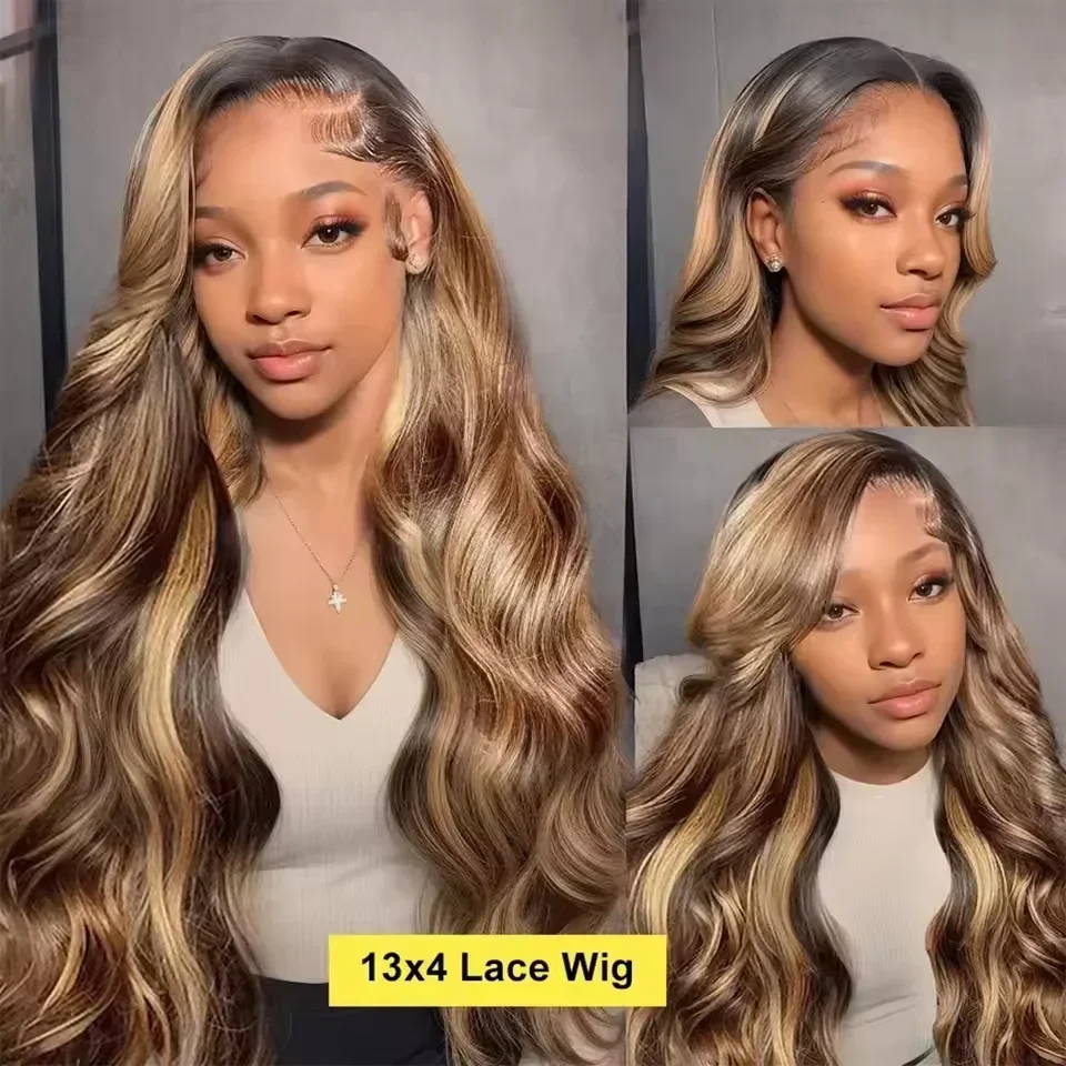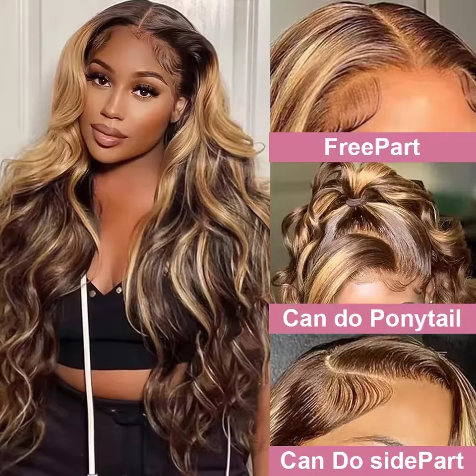 HD Lace Frontal Wigs Honey Blonde Colored Highlight Body Wave Human Hair Pre-plucked