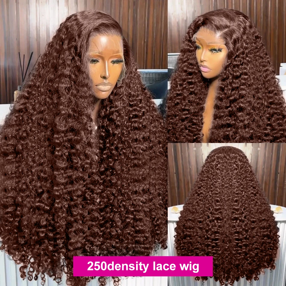 200% Chocolate Brown Deep Wave Human Hair Wig Transparent Lace Frontal Wigs For Women 13x6 Lace Front Water Curly Wigs
