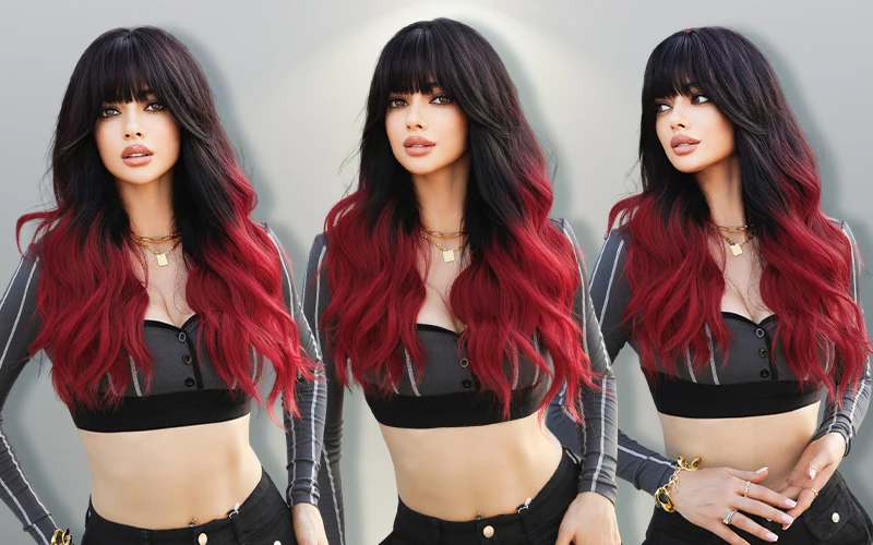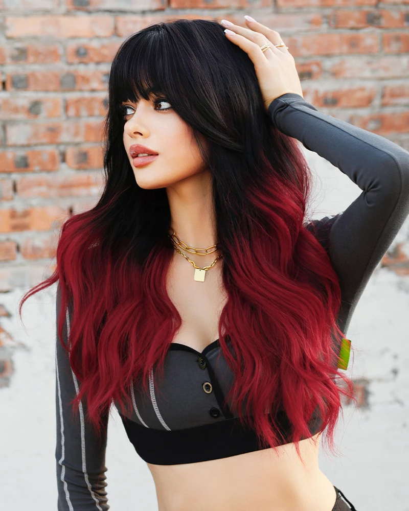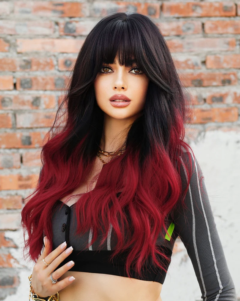 NAMM Long Wavy Ombre Black To Red Wig for Women Daily Synthetic Lavender Hair Wig with Fluffy Bangs Heat Resistant