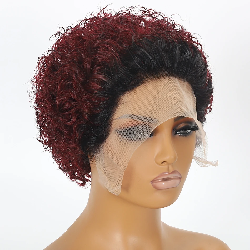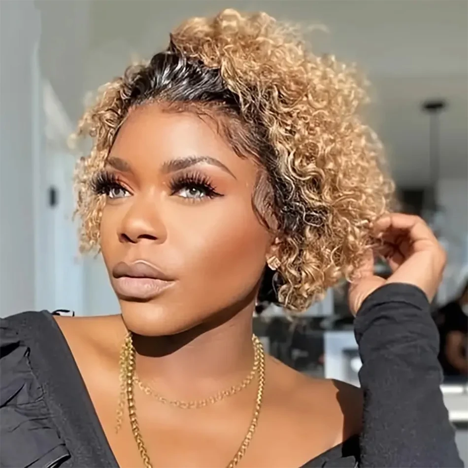 Pixie Cut Wig Kinky Curly Human Hair Wig Honey Blonde Burgundy Colored Short Curly Bob Wigs Pre plucked 13x1 Lace Frontal Wigs